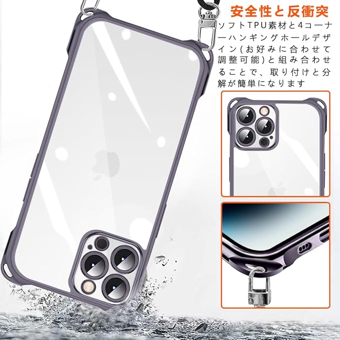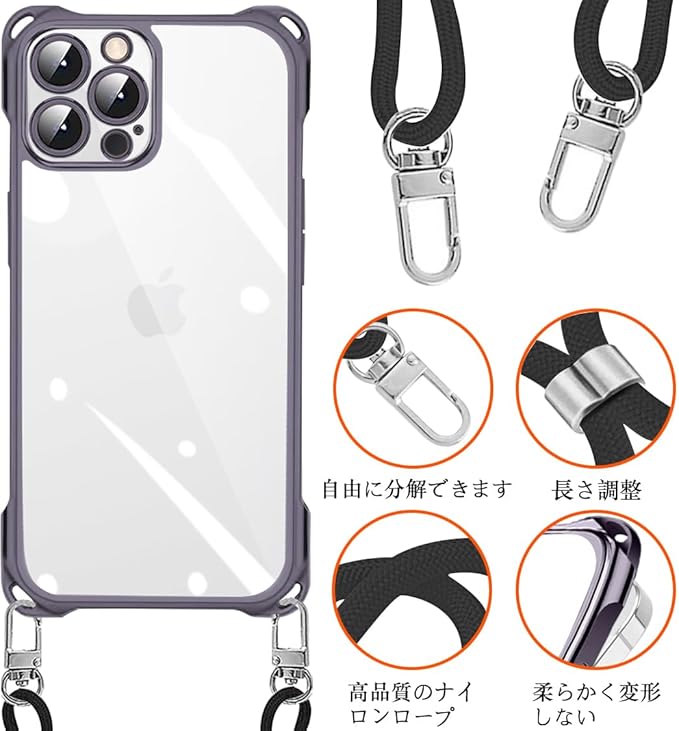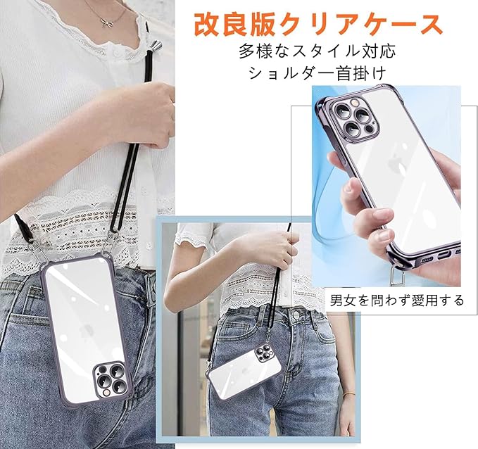 iPhone 15 Pro Max 用 ケース クリア ショルダー TPU メッキ加工 アイフォン15 Pro Max ケース 新型韓国 チャーム シリーズ 肩掛け 斜めかけ 首掛け 縄掛け 薄型軽量 耐衝撃 1.5MM 取り外し可能 Qi急速充電対応 全面保護 落下防止 iphone 15 pro max カバー | KAZESHOP