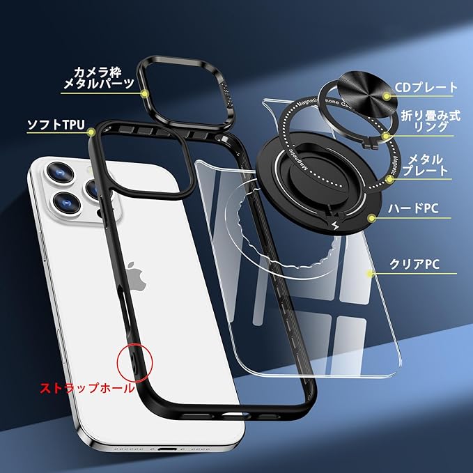 【車載ホルダー・Magsafeアクセサリー対応】 背面リング部分の土台は金属製なので、マグネット式の車載スマホホルダーに装着可能です。 MagSafe電源グループ・MagSafeウォレットに対応しております。