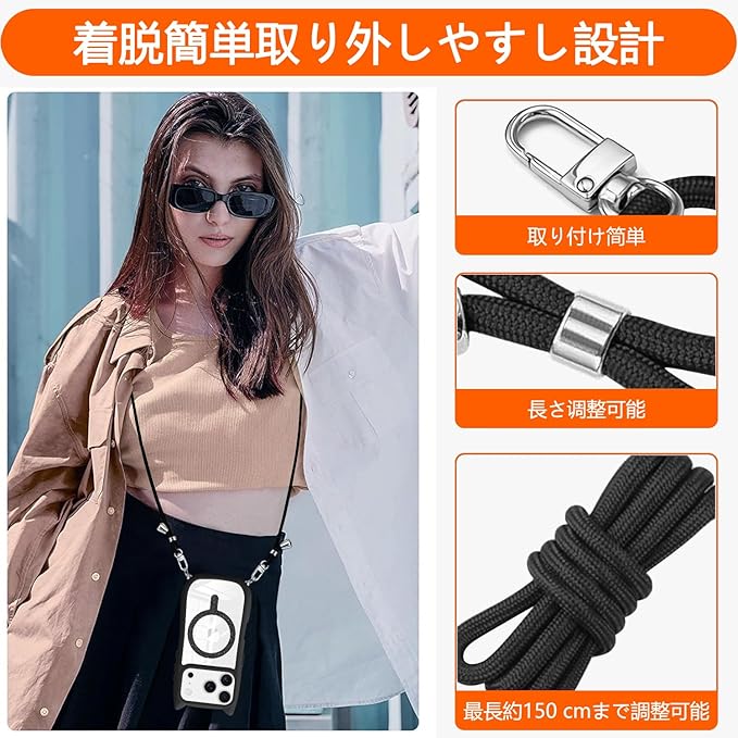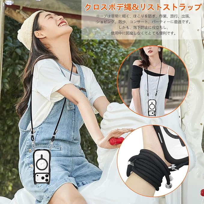 【取り外し可能なストラップ 利便性に優れる】ケース側面に専用のストラップ取り付け部を設け、付属のナイロン製ストラップを簡単に装着・取り外しできる構造となっています。ストラップは適度な強度と柔らかさを備え、長時間使用しても首や手に負担がかかりにくく;外出時にストラップを装着することでスマホの落下を防ぎ、バッグのフックに掛けて持ち運ぶことも可能です。使用シーンに合わせてストラップの有無を切り替えられ、日常の使い勝手を大幅に向上させます。