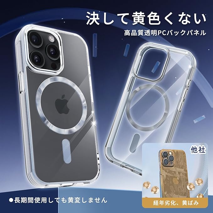 iPhone 15 Pro Max 用の ケース MagSafe対応 クリア 耐衝撃 【内部スプレー塗装技術】 色あせ防止 アイフォン 15 Pro Max 用のスマホケース ワイヤレス充電 米軍MIL規格 いphone 15ProMax 用の カバー マグセーフ 透明 ストラップホール付き 衝撃吸収 黄ばみ防止 軽量 滑り止め (シルバー) | KAZESHOP