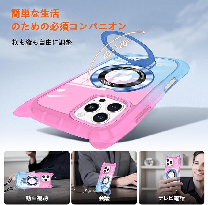 【スタンド機能】隠しスタンドの設計で、省スペース性に優れ、収納するときは水平的に置けできて、持ち運びの邪魔になりません。縦置きでも横置きでも安定して支えられ、40 ~ 120 の間で多角度自由に調整できます。横向きでの動画鑑賞も楽しめ、縦向きでのビデオ通話も快適です。スタンド台を持ち運ぶ必要がなくなり、外出時にも便利です。手に取るだけでリングとしても使えるので、機能性にも優れています。【多目的キャリー & ファッションデザイン】調節可能なストラップにより、サイド、またはフロントに持ち運べるときに完璧にあなたの隣に掛けることができます。 このアクセサリーはファッションだけでなく、通常のストラップよりも快適で実用的です。 作業、旅行、出張、ショピング、散歩、コンサート、パーティーに最適です。手を離しても、携帯電話を携帯できます。