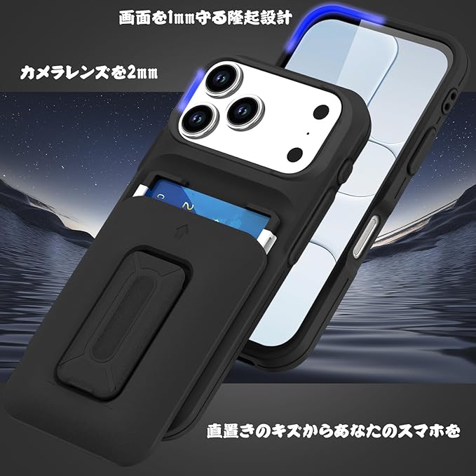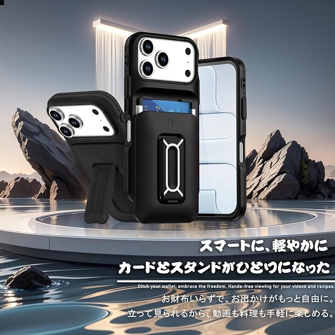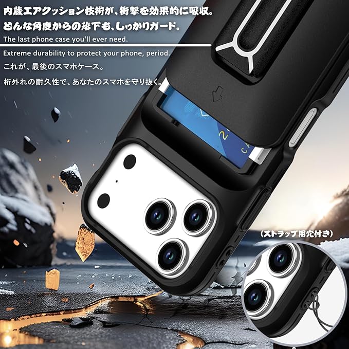 対応 アイフォン17 Pro Max ケース, iPhone 17 Pro Max ケース カード収納2枚 & スタンド付き 耐衝撃 カメラレンズ保護 米軍MIL規格 指紋防止 ストラップ穴付き 全面保護(ブラック) | KAZESHOP