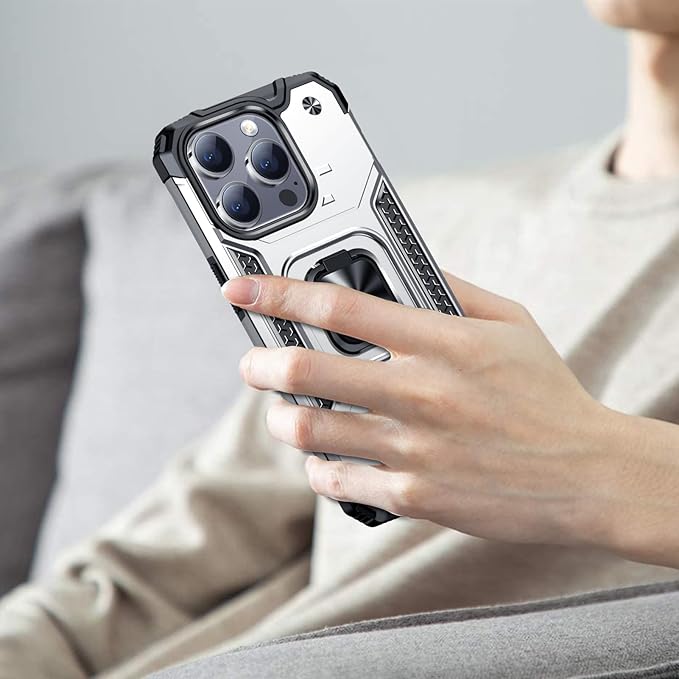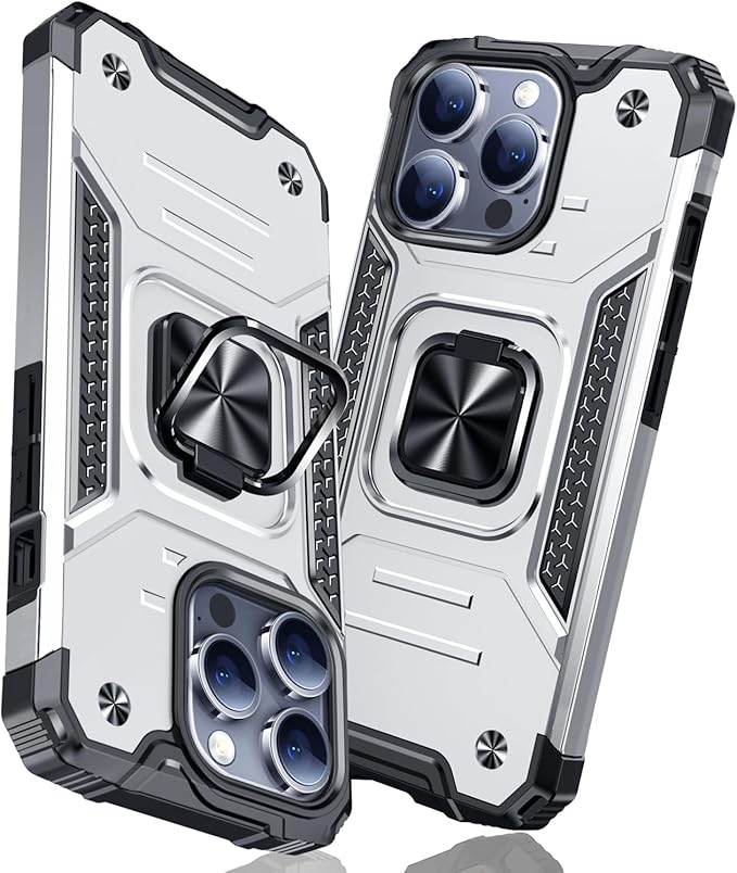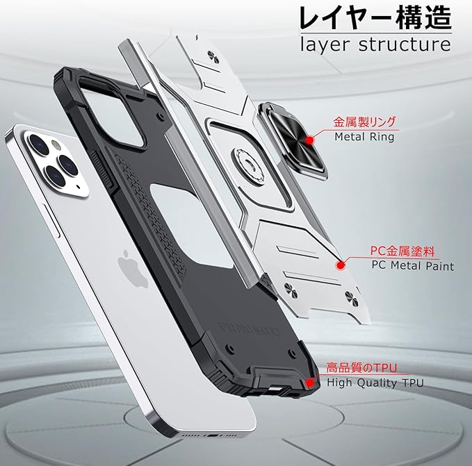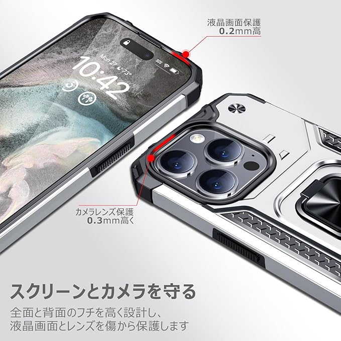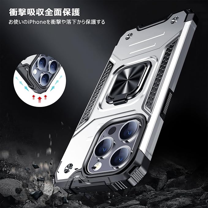iPhone 15 Pro Max 用ケース リング 衝撃吸収 耐衝撃 TPU+PCバンパー 二重構造 米軍MIL規格 全面保護カバー 滑り防止 車載ホルダー対応 擦り傷防止 滑り止め 軽量 薄型 アイフォン 15 pro max 用カバー 6.7インチ 指紋防止 耐久 おしゃれ 人気 携帯カバー 銀 MZ62-95 | KAZESHOP