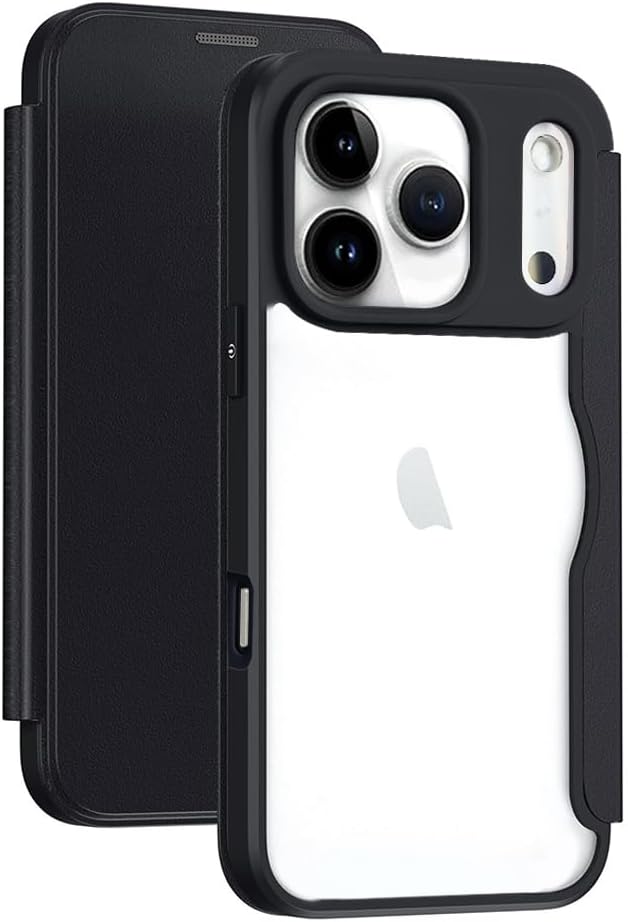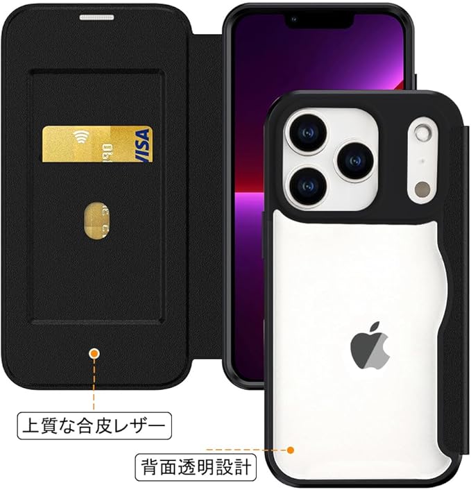 スマホケース 対応 iPhone 17 Pro Max ケース 手帳型 背面 クリア 透明 高級なPUレザー+PCパネル+TPUバンパー マグネットが内蔵 衝撃吸収 軽量薄型 ブランド アイフォン 17プロマックス 手帳型カバー (ブラック) | KAZESHOP