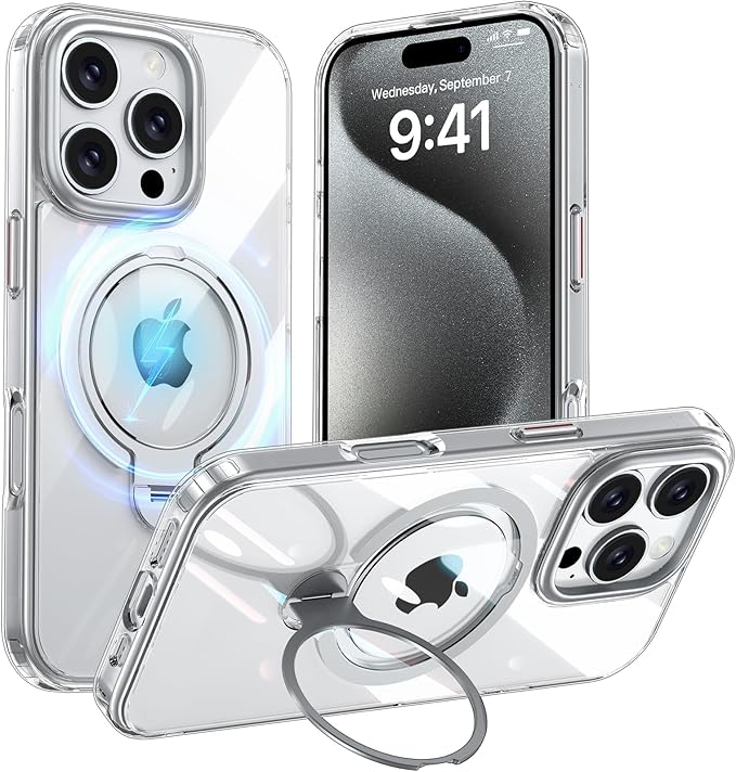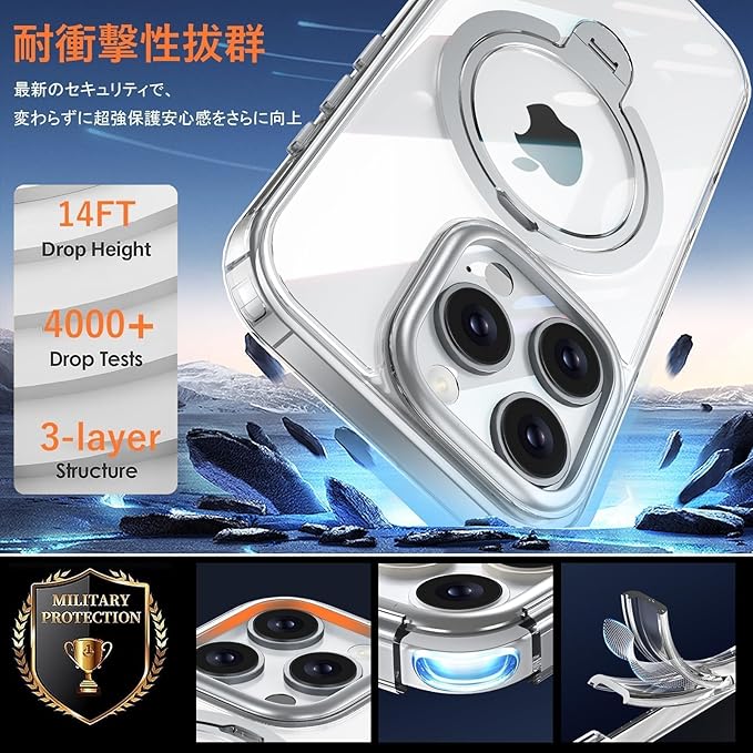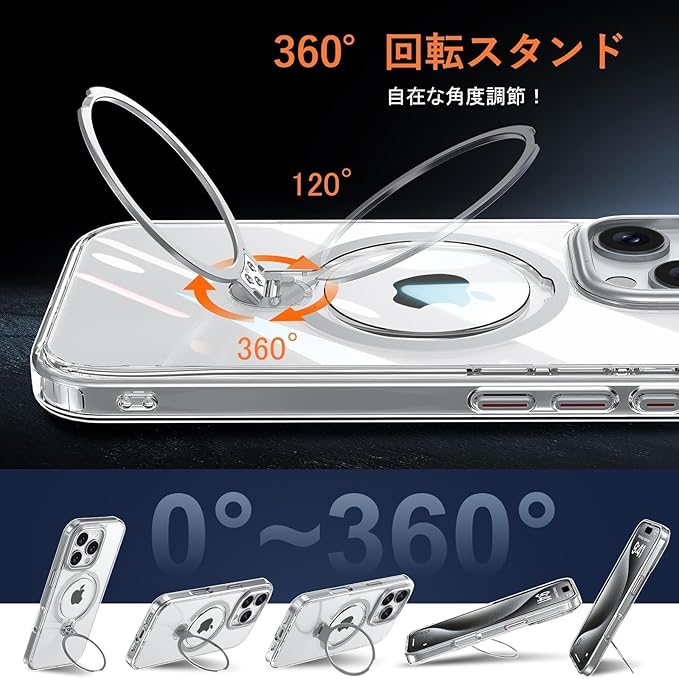iPhone 16 Pro Max 用 ケース MagSafe対応 リング360 回転スタンド機能 縦横両対応 透明 黄ばみ防止 ワイヤレス充電 いphone16 Pro Max スマホケース レンズ保護 米軍規格 耐衝撃 携帯カバー アイフォン 16 プロ マックス ケース マグネット搭載 車載ホルダー マグセーフ対応 おしゃれ クリア | KAZESHOP