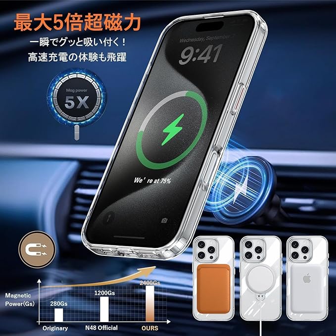 【MagSafe対応・ワイヤレス充電】本製品はMagSafeテクノロジーに対応し、ワイヤレス充電を迅速かつ効率的に行えます。車載ホルダーやスタンドとして多用途に対応し、特にドライブ中のスマホ操作を快適にサポートします。内蔵された磁気リングがデバイスをしっかりと固定し、安全かつスムーズな充電を実現。Qi規格にも対応しており、幅広いワイヤレス充電器との互換性も備えています。