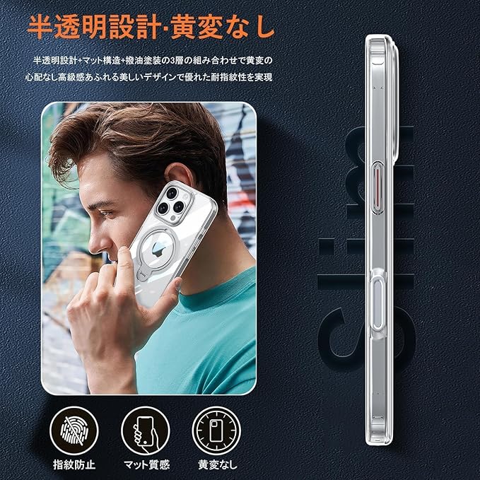 【驚異の透明度・黄ばみ防止技術搭載】透明感を極限まで追求した高品質な素材を使用し、驚異的な透明度を実現しています。スマホ本来の美しさを引き立てる独自の光沢感は、触れるたびに感動を与えます。また、黄ばみ防止技術を採用しており、長期間にわたって美しい透明度を保ちます。さらに、防滑性も備えているため、スマホを手に持つ際の安定感も抜群です。