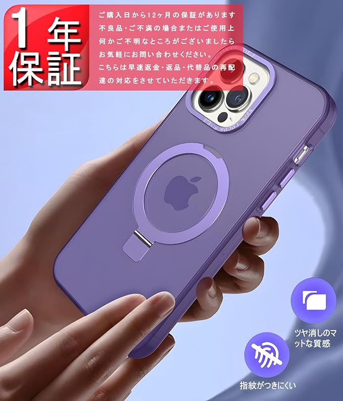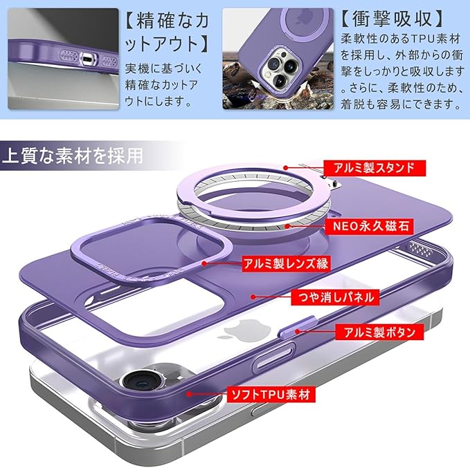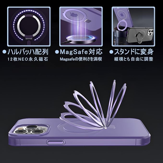 【スタンド】360度ぐるぐる回せて、角度{節もできるスタンドが最大の特徴。見やすいポジションでiPhoneを固定できるので、縦向きのビデオ通話も横向きの動画鑑賞も快適に楽しめます。スタンドを収{すると背面がほぼフラットになり、邪魔にならない点もうれしいです。