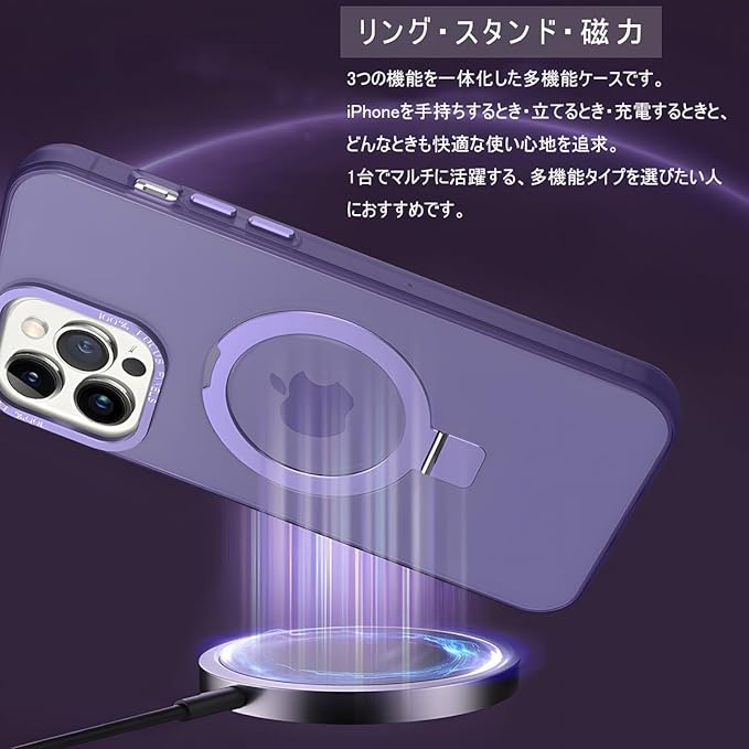 【リング・スタンド・磁力】3つの機能を一体化した多機能なiPhone15用ケースです。iPhoneを手持ちするとき・立てるとき・充電するときと、どんなときも快適な使い心地を追求。1台でマルチに活躍する、多機能タイプを選びたい人におすすめです。