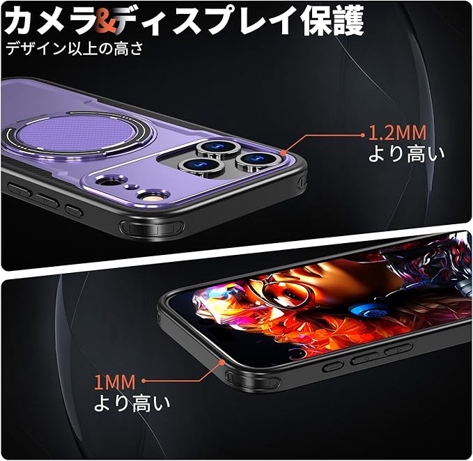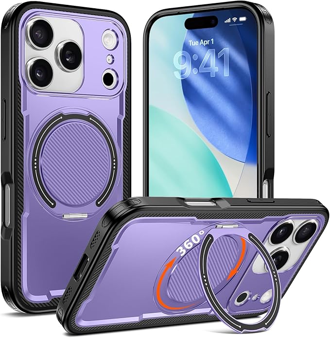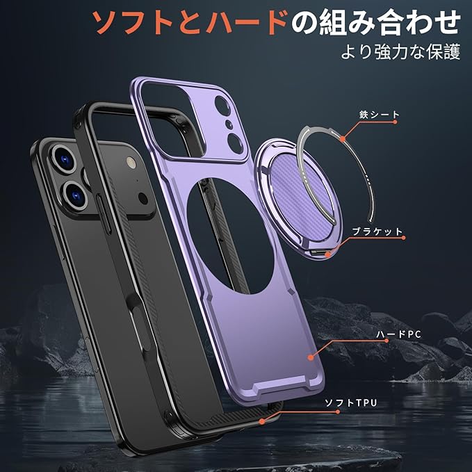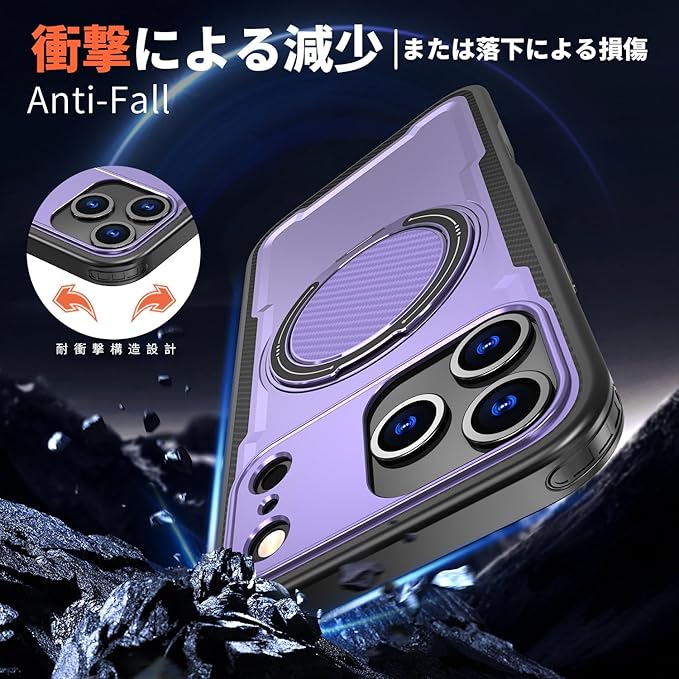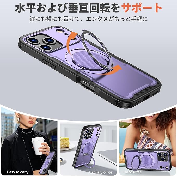 iPhone 17 Pro Max 用 ケース 耐衝撃 スタンド付き MagSafe対応 米軍MIL規格 いPhone 17 Pro Max カバー ワイヤレス充電 防指紋 縦横両対応 360 回転スタンド 炭素繊維テクスチャ ファッション 紫121-IP17PM-04 | KAZESHOP