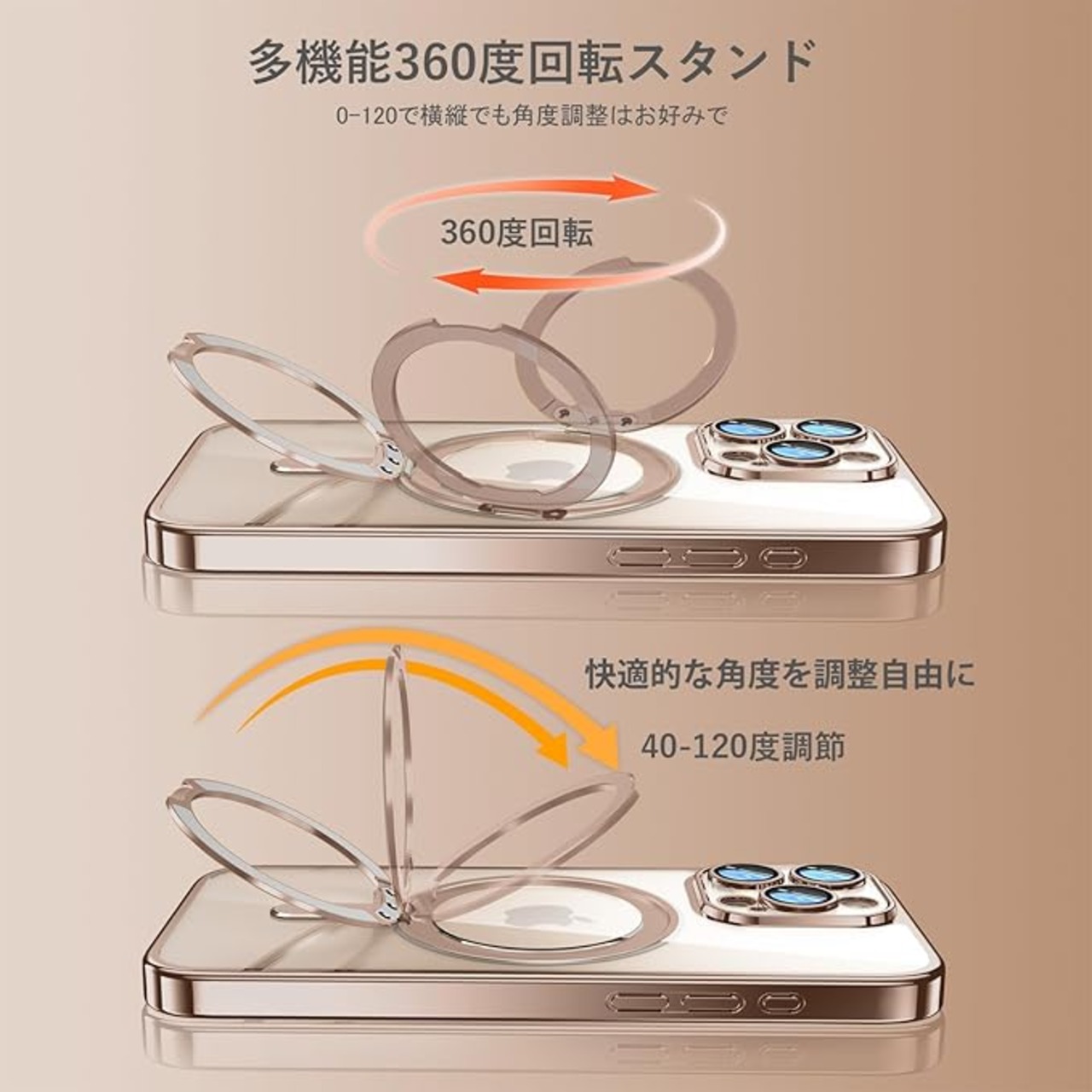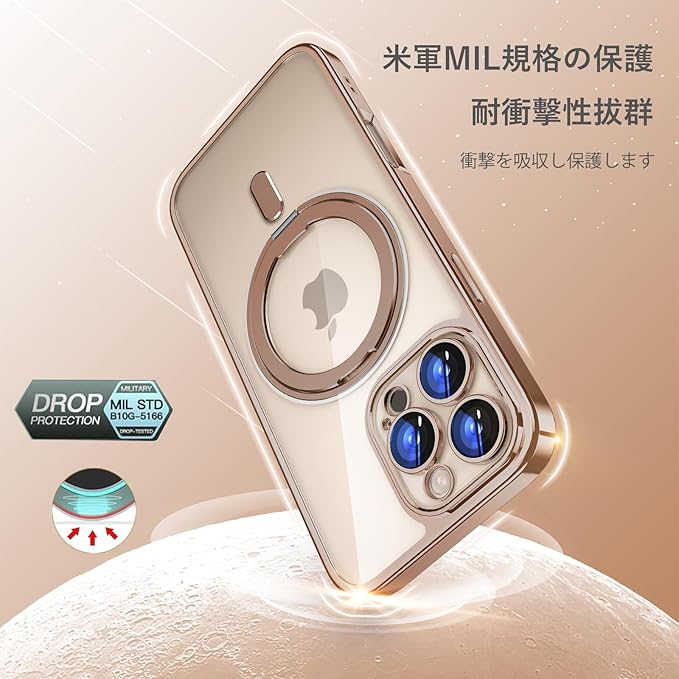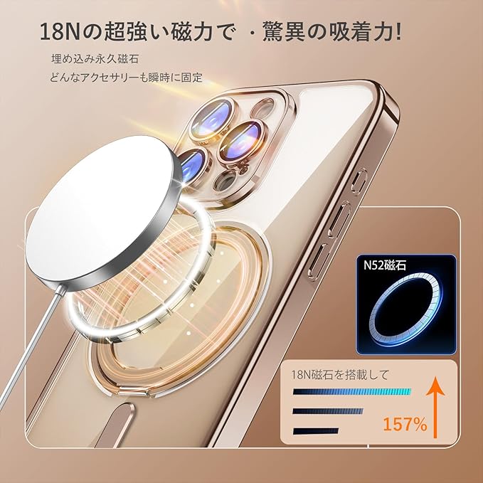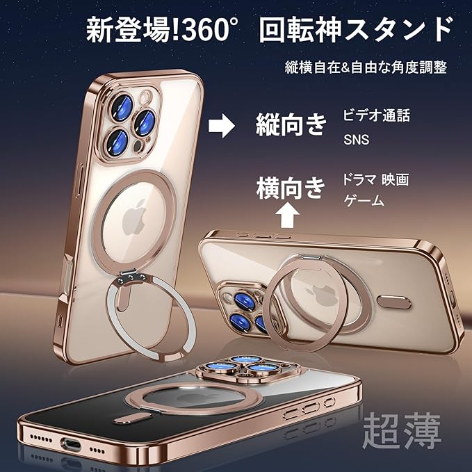 MagSafe対応:超世代的な隠しスタンドと強力なマグネットリングの強力な結合により、高い吸着力でガッチリと固定しながら充電ができます。安定性を持ち、充電器を近づけると高速ワイヤレス充電が実現です。また、磁気を利用しているため充電器以外にもスタンドやウォレットなどのアクセサリーに固定可能。