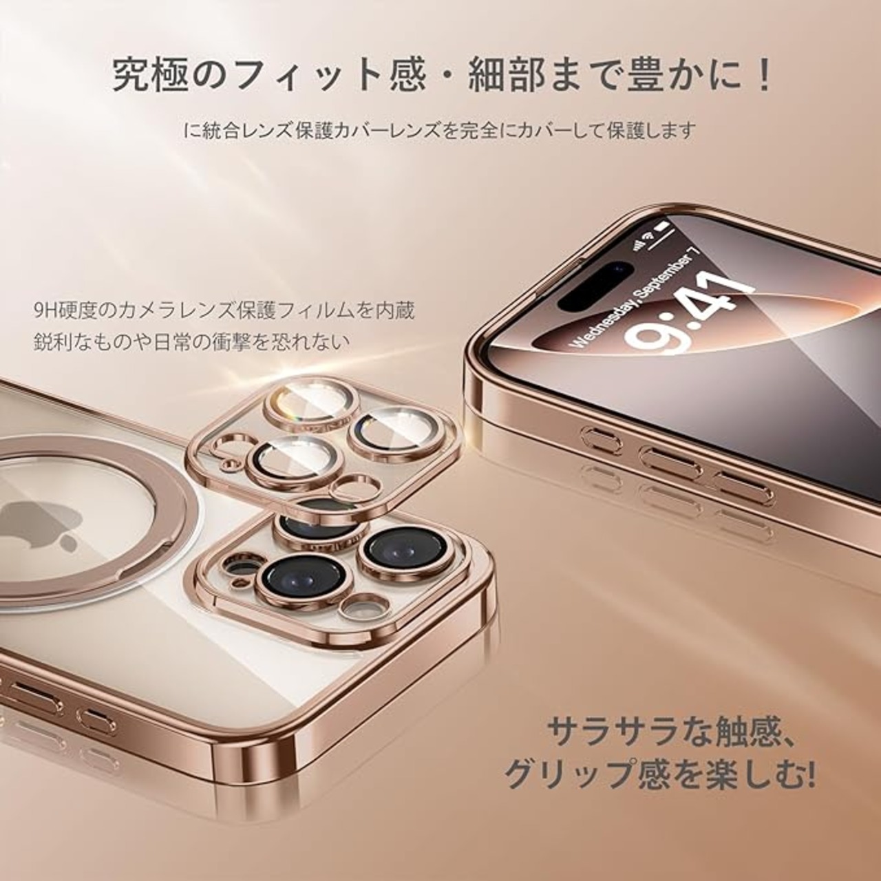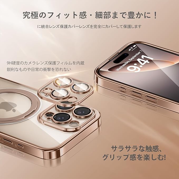 驚きの触り心地:背面はドイツ製原材料を使用し、特殊加工により高い透明度を実現。フレームは4層メッキ加工技術と超微細なレーザー加工技術によって設計。オシャレで独特の輝きを放ち、アイフォンの原始的な美しさを維持しながらラグジュアリー感と高級感を加えています。また、付属のストラップホールには、お好みなのアクセサリーをつるすことができます。