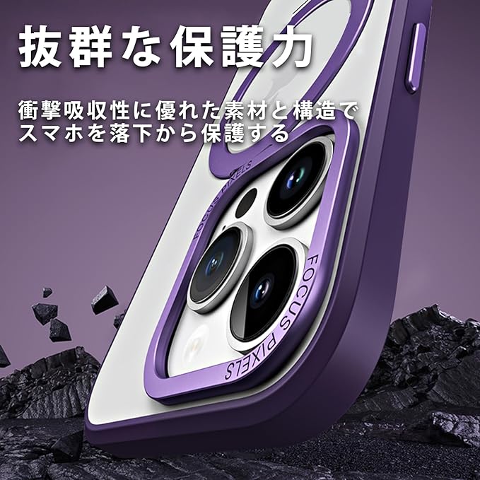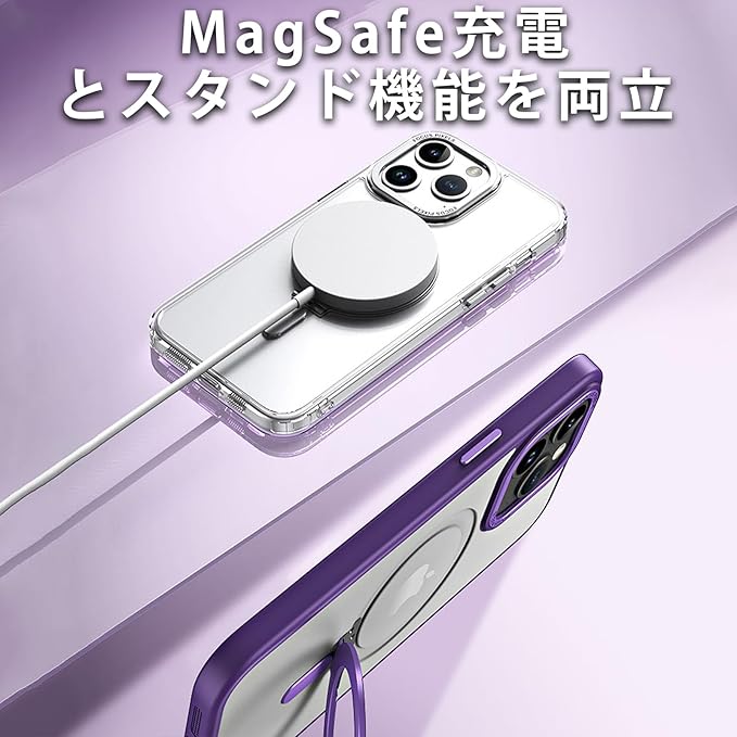 iPhone 15 Pro Max 用ケース MagSafe対応 スタンド機能付き 横縦対応 米軍MIL規格 耐衝撃 ワイヤレス充電対応 クリア シンプルで高級