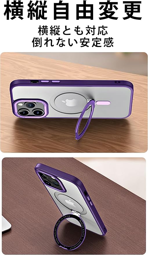 【横縦対応スタンド】隠し収納式スタンドは横縦とも対応します。縦でも抜群安定しているのでiPhone15 プロマックスをより快適に使用できます。使用しないときはリングを隠して収納できます。使用する時はリングを簡単に出せます。