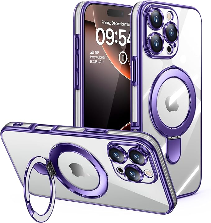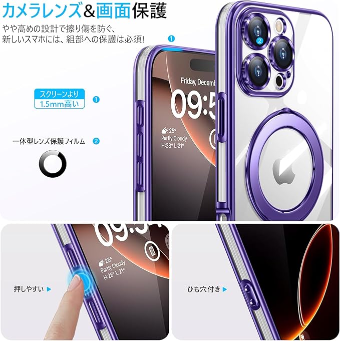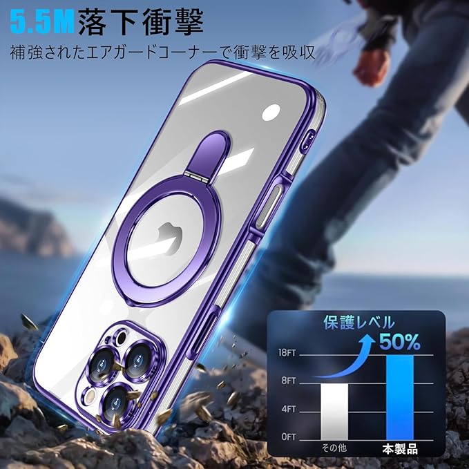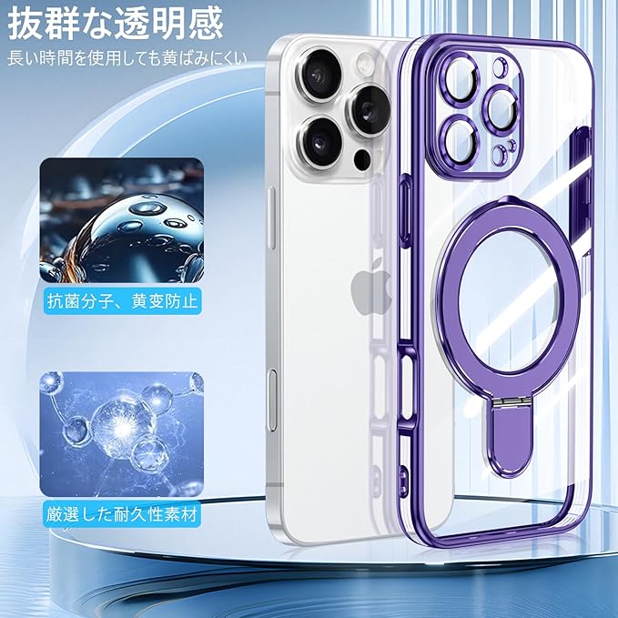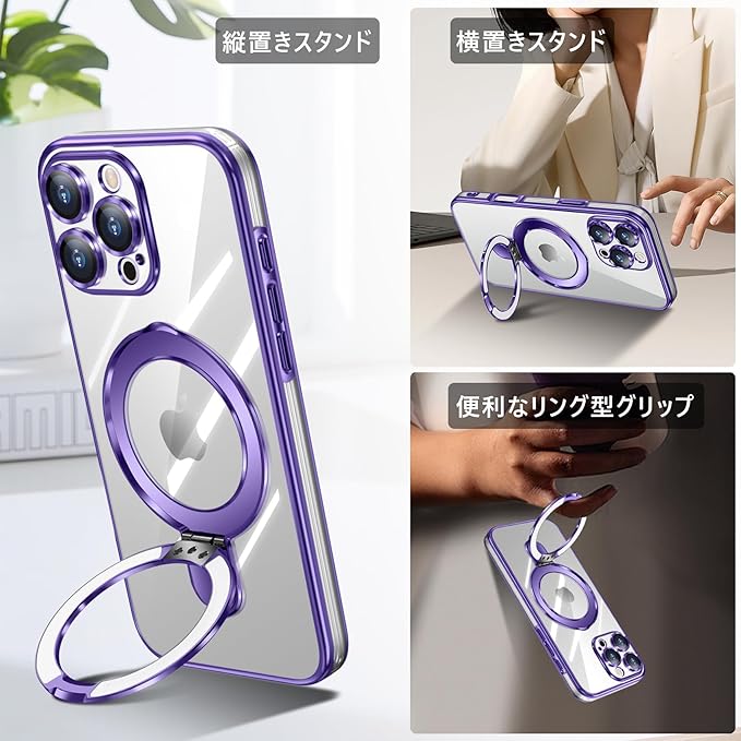 iPhone 16 Pro Max 用ケース クリア Magnetic対応 リング付き 一体型レンズ保護 柔軟TPU 軽量 薄型 アイフォン 16 pro max 用ケース 耐衝撃 スタンド機能 黄変防止 耐久性 ストラップホール付き 携帯カバー 紫 WY98-15 | KAZESHOP