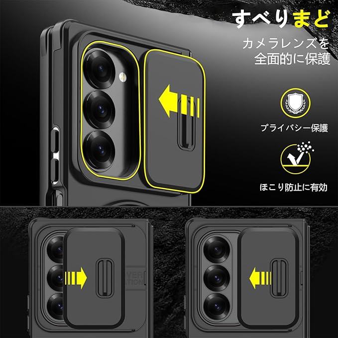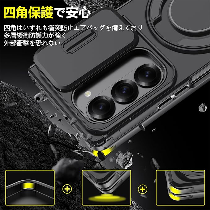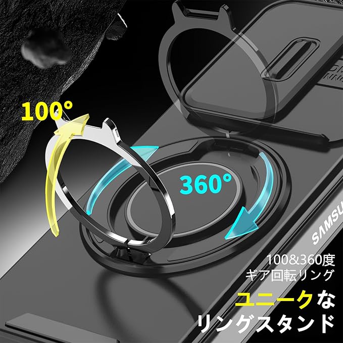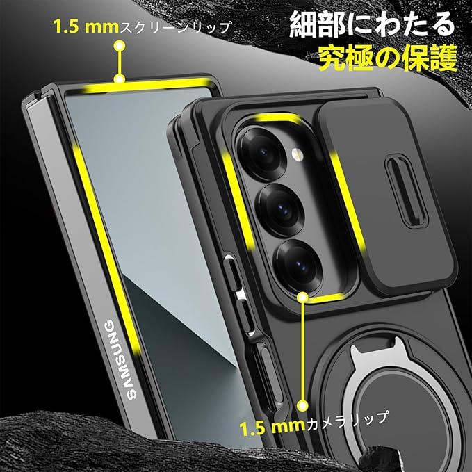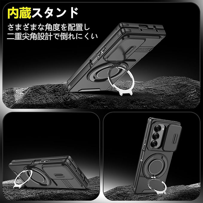 対応 Galaxy Z Fold7 用 ケース スタンド付き リング付き 耐衝撃 レンズ保護 スライドカメラカバー TPU+PC 軽量 滑り止め 落下保護 スタンド機能 車載ホルダー対応 ギャラクシー Z フォールド7 5G 携帯ケース 黒 R-LK-Fold7-01 | KAZESHOP