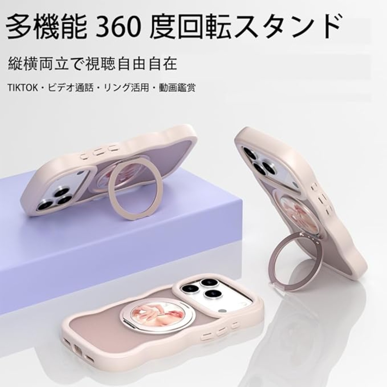 【360度!隠し多機能スタンド】多機能スタンドとリング一体型の斬新なデザインです。ケースを閉じれば背面はスマートに平坦に。縦置きでも横置きでも安定して支えられ、ケースを開けるだけでスタンドの完成!指にかければリングも便利に使用でき!また、安定したアルミ合金製の円形スタンドを採用しており、携帯性からもファッション性からも唯一無二の存在です。