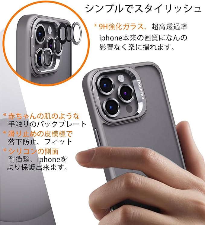 *【対応機種と素材】iPhone 15 ProMax対応、サイズ:6.7インチ対応、ケースのサイズ:約縦16 横8.5 厚1.1 cm 主素材:シリコーンサイド、アクリル背面マット感のプレート、合金のカメラ隠しスタンド、メッキ金属ボタン、御洒落な9H強い硬度ガラスレンズを贈ります。御アイフォンをしっかり守れます。