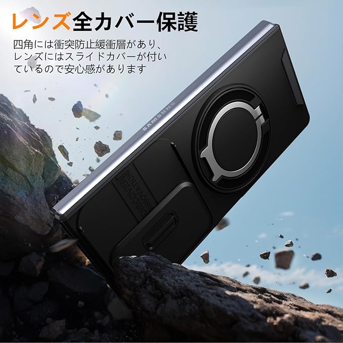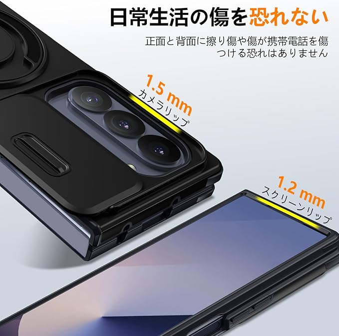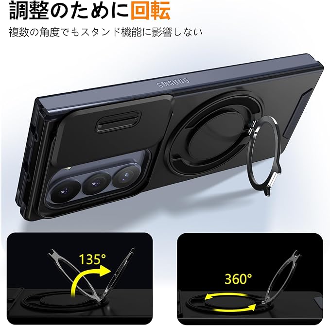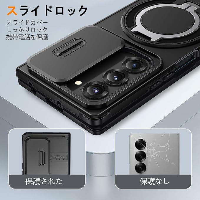Galaxy Z Fold7 用 ケース リング付き スライド式カメラカバー 隠しスタンド 耐衝撃 スタンド機能 縦横両対応 車載ホルダー PC TPUバンパー 防塵 人気 落下防止 滑り止め 指紋防止 ギャラクシー Z フォールド7 5G カバー 黒 MJJ-1065-07-01 | KAZESHOP