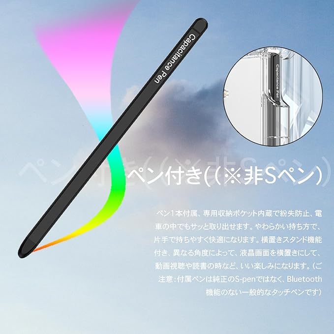 【ペン付き((※非Sペン))|スタンド機能】ケースの折り畳む部分には、しっかりと固定できるペン収納ケースがあります、また、ペン1本付属、専用収納ポケット内蔵で紛失防止、電車の中でもサッと取り出せます。やわらかい持ち方で、片手で持ちやすく快適になります。横置きスタンド機能付き、異なる角度によって、液晶画面を横置きにして、動画視聴や読書の時など、いい楽しみになります。(ご注意:付属ペンは純正のS-penではなく、Bluetooth機能のない一般的なタッチペンです)