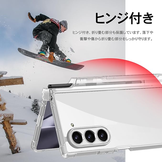【四角耐衝撃タイプ|ヒンジ付き|折り畳む保護】四角耐衝撃タイプ、このケースの四角が周辺より厚い。落下や衝撃や傷から本体をしっかり守ります。ヒンジ付き、折り畳む部分も保護しています、落下や衝撃や傷から折り畳む部分をしっかり守ります。PC材質採用して、割れにくいです。全面保護で、傷などからGalaxy z Fold 7本体をガードしています。見た目が綺麗、オシャレ感up!