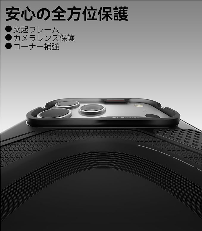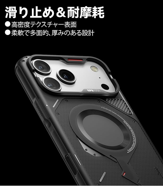 【安心のグリップ感】背面と側面に施されたテクスチャー入り滑り止めストリップにより、しっかり握れて落下防止にも安心。対応機種:いphone17pro max ケース