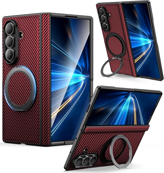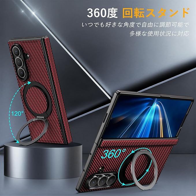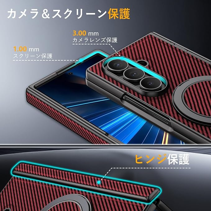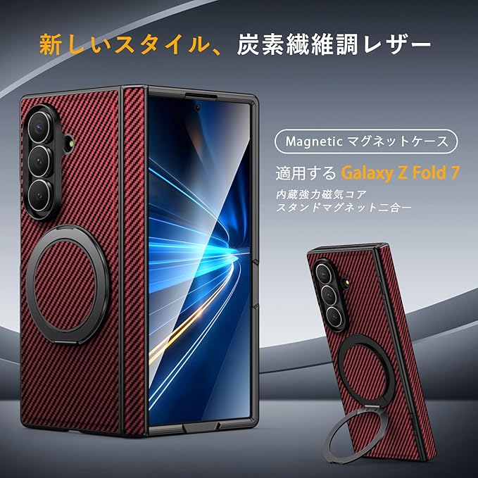 Duluqboba Galaxy Z Fold7 対応 ケース リング付き 耐衝撃 360 回転スタンド 炭素繊維風テクスチャー ケース ヒンジ保護 縦横両対応 隠しスタンド マグネット搭載 レンズ保護 薄型 軽量 頑丈 PC背面 マット仕上げ 指紋防止 擦り傷防止 カーボン風 人気 赤 AYS-31-4 | KAZESHOP