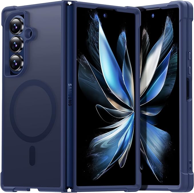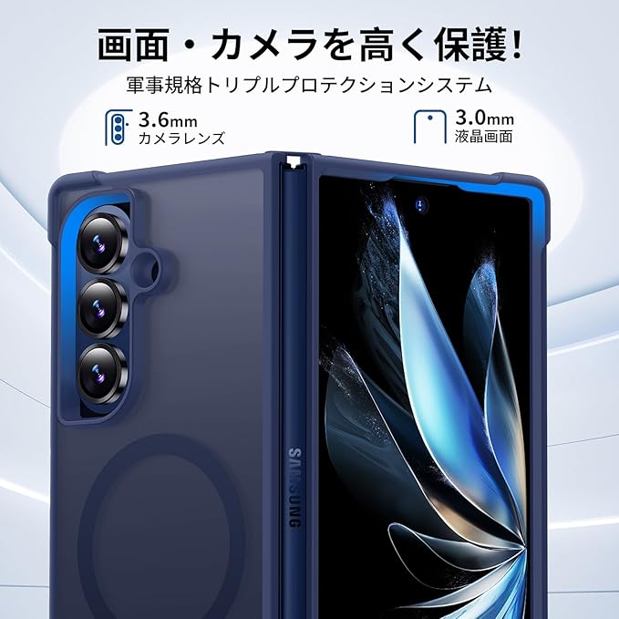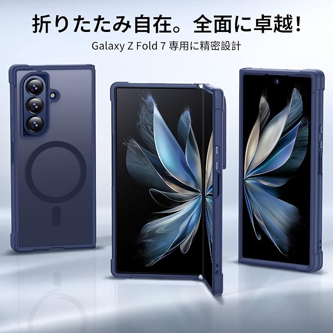 Aunote Galaxy Z Fold7 ケース MagSafe対応 ワイヤレス充電 マット 半透明 ヒンジ保護 米軍MIL規格 耐衝撃 マグネット搭載 ストラップホール付き 指紋防止 レンズ保護 Samsung Z Fold7 スマホケース カバー ブルー | KAZESHOP