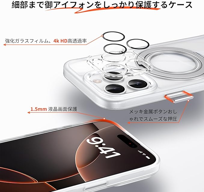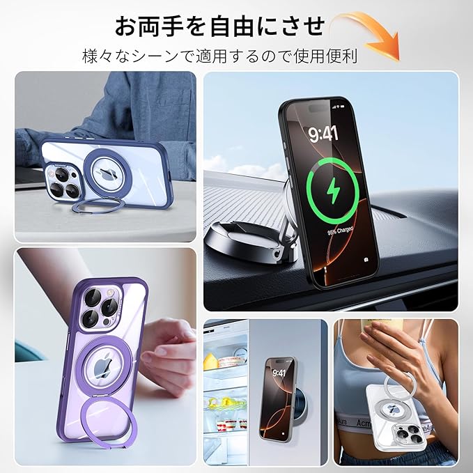 【マグネット搭載で強力な磁力吸着】ケースのスタンドに強力なN52マグネットを搭載して、マグセーフ対応の様々なアクセサリーを適用します。MagSafe対応の充電器や車載ホルダー、あらゆる充電に安定で接着ができ、料理中に冷蔵庫に吸い込むことができ、映画を見たりして家族のために楽しく食事を作ることができます。(Qi充電には対応しませんのでご注意ください)