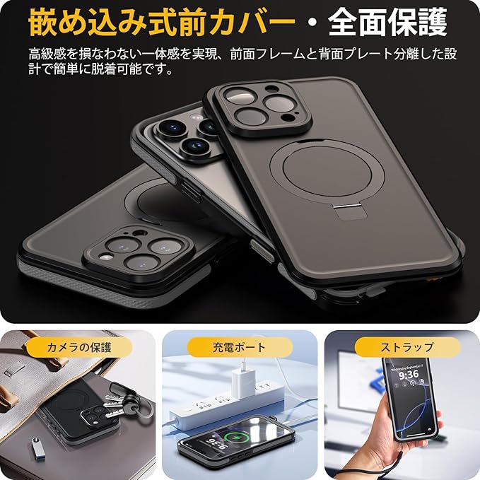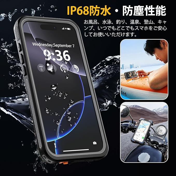 【IP68防水認証取得】iPhone 16 Pro Max 専用の完全防水防塵ケースです。最高防水レベルのIP68認証を取得し、水深さ2Mの水中に1時間まで水没でき、さらに水中撮影でも対応出来ます。防水機能だけでなく、砂・ホコリ・ゴミなどの侵入も防ぎますので、お風呂、水泳、釣り、温泉、登山、キャンプ、いつでもどこでもスマホをご安心してお使いいただけます。