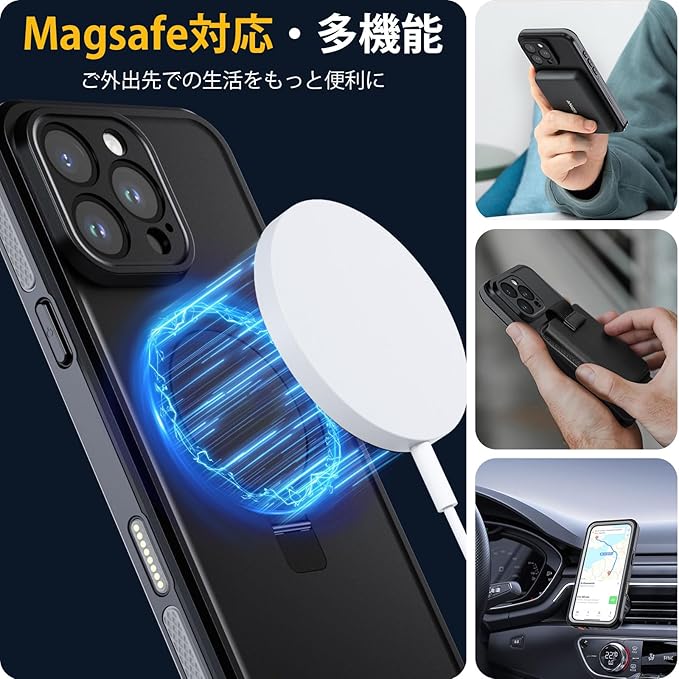 【スタンド機能・MagSafe対応】便利な隠れスタンドはケースと一体型になり、絶妙なデザインで携帯を自由に多角度を調節でき、力よくスマホを支えて、映像や読書などに楽しめることができます。強力なN52マグネットを搭載しており、マグセーフ充電器やその他様々なマグセーフマグネットアクセサリーをしっかりと保持します。また、急速充電可能です、マグセーフアクセサリーとの完全な互換性があり、安心してお使いいただけます。