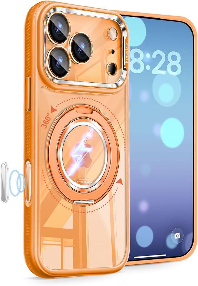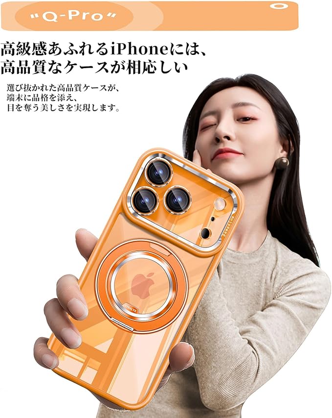 iPhone 17 ProMax用ケースMagsafe対応 360度回転リングスタンド付き 薄型 クリアアクリル シリコン耐衝撃 滑り止め カメラコントロールボタン オシャレな着脱カメラカバー かわいいアイフォン17プロマックスケース オレンジ | KAZESHOP