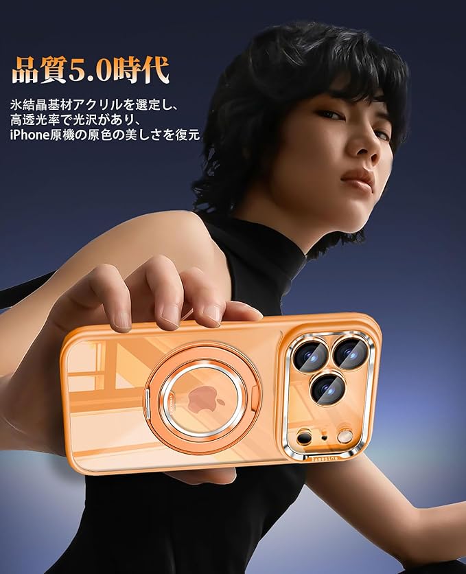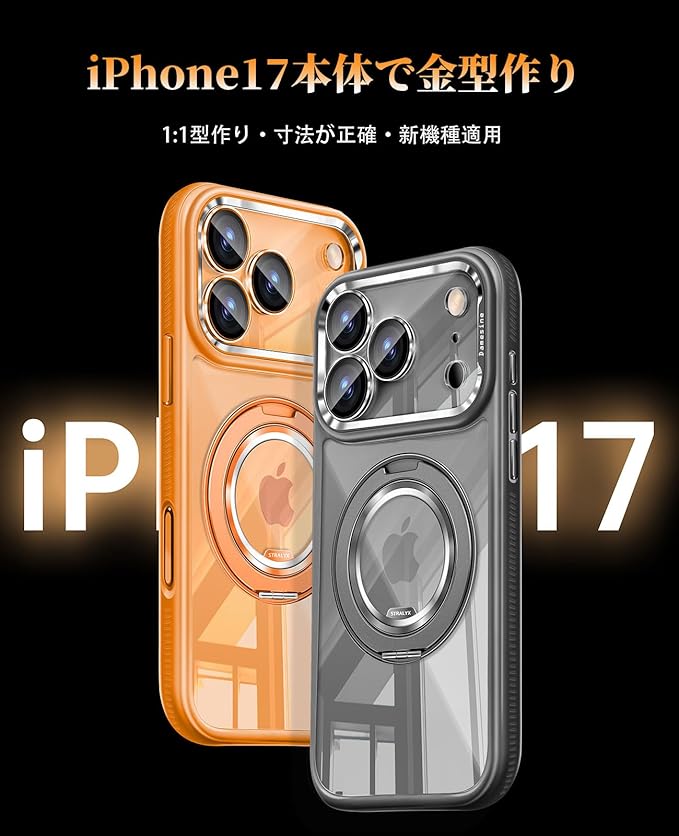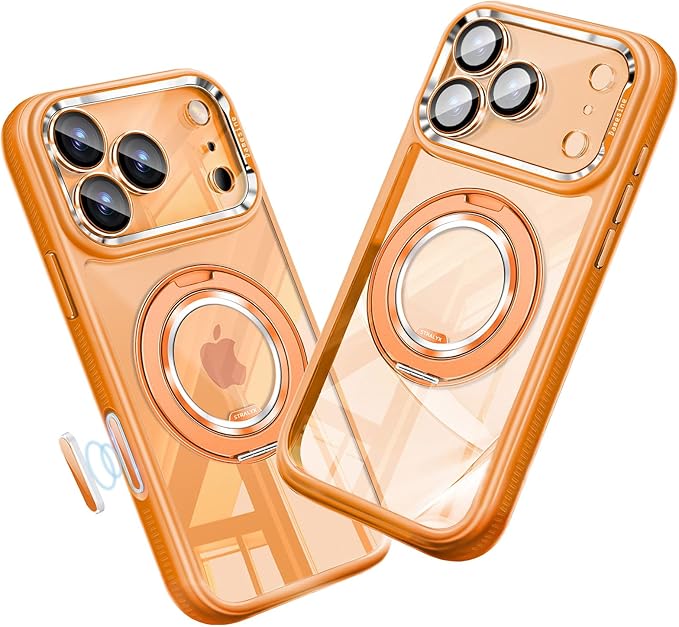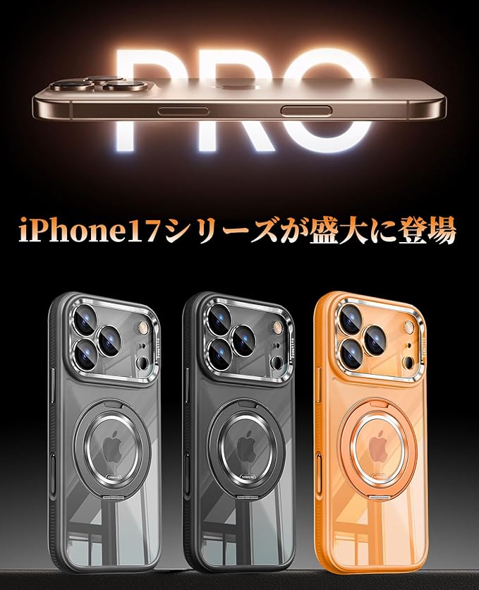 iPhone 17 ProMax用ケースMagsafe対応 360度回転スタンド クリア背面シリコンサイド耐衝撃 滑り止め カメラコントロールボタン付きキラキラなカメラカバー着脱可能 薄型 防塵ネット オシャレなアイフォン17プロマックス ケース オレンジ | KAZESHOP