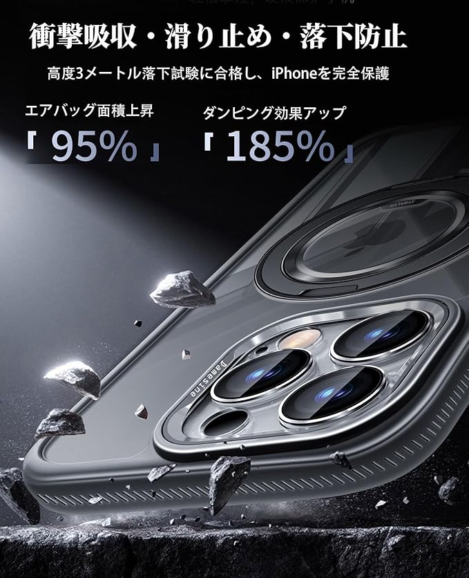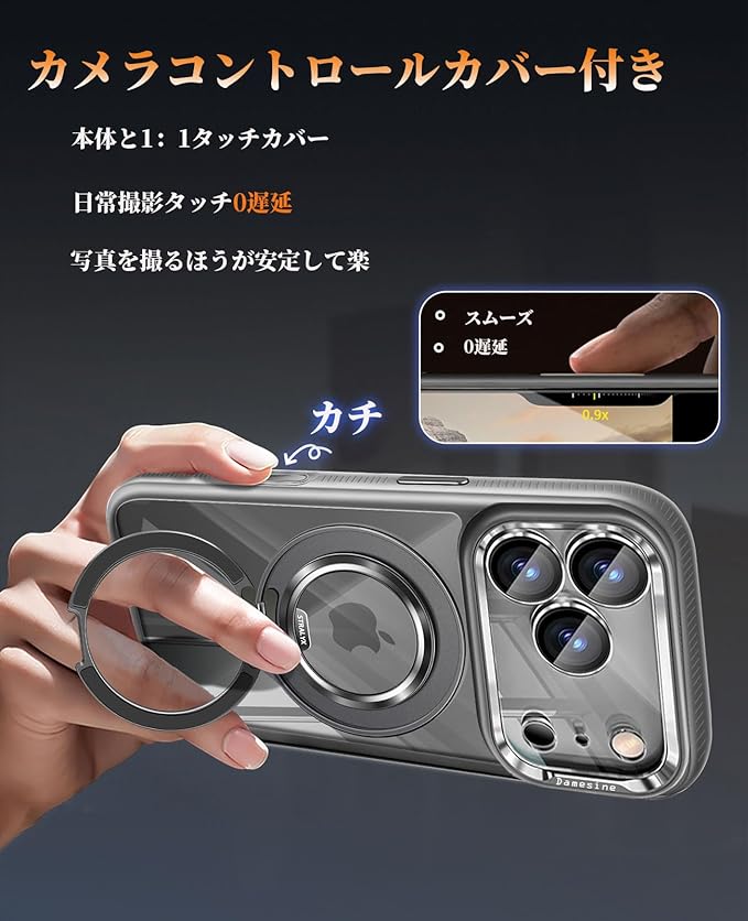 【360 回転可能な超耐久マグネットスタンド】 厚め合金製のリングスタンドは38個の強力マグネットを内蔵し、あらゆる角度で安定した視聴位置をキープ。リングスタンドを回転する時の「カチッ」と解圧感のある音、元気づけてくれます。MagSafe機能とワイヤレス充電対応、ケースを装着したままでも超高速で確実に充電できます。