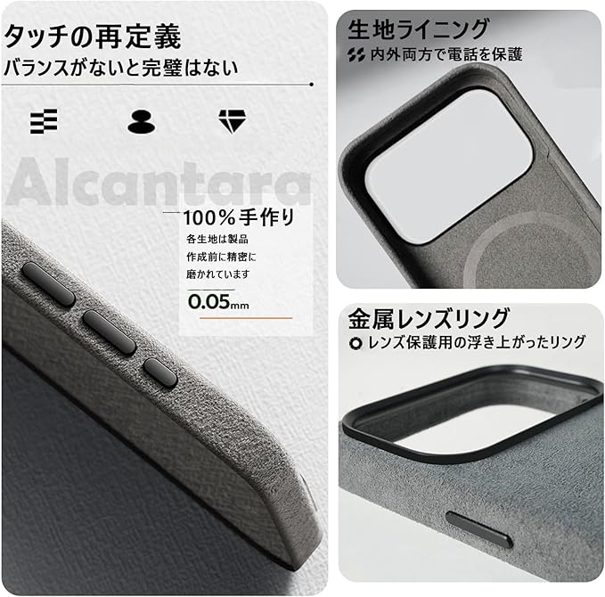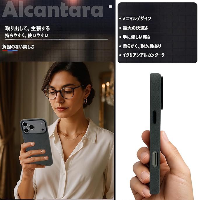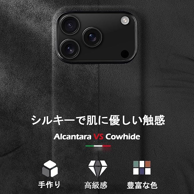 【Alcantara(アルカンターラ)正規素材】イタリア Alcantara 正規素材を使用。高級車内装にも採用される上質な手触りと、落ち着いた高級感をスマホでも楽しめます。