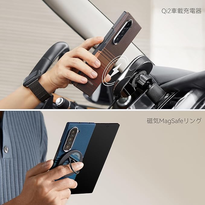 【MagSafeに対応、置くだけピッタリくっつける】超強力なマグネットが内蔵され、MagSafeにぴったり対応。Galaxy Z Fold 7本体をMagSafeアクセサリー接続で便利にお使いいただけます。またPITAKAのスマホリングMagEZ Grip3や、NFC対応Qi2.0車載充電器MagEZ Car Muont Pro2 Qi2に最適です。
