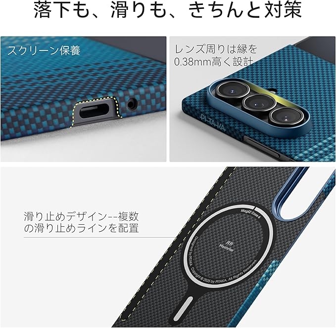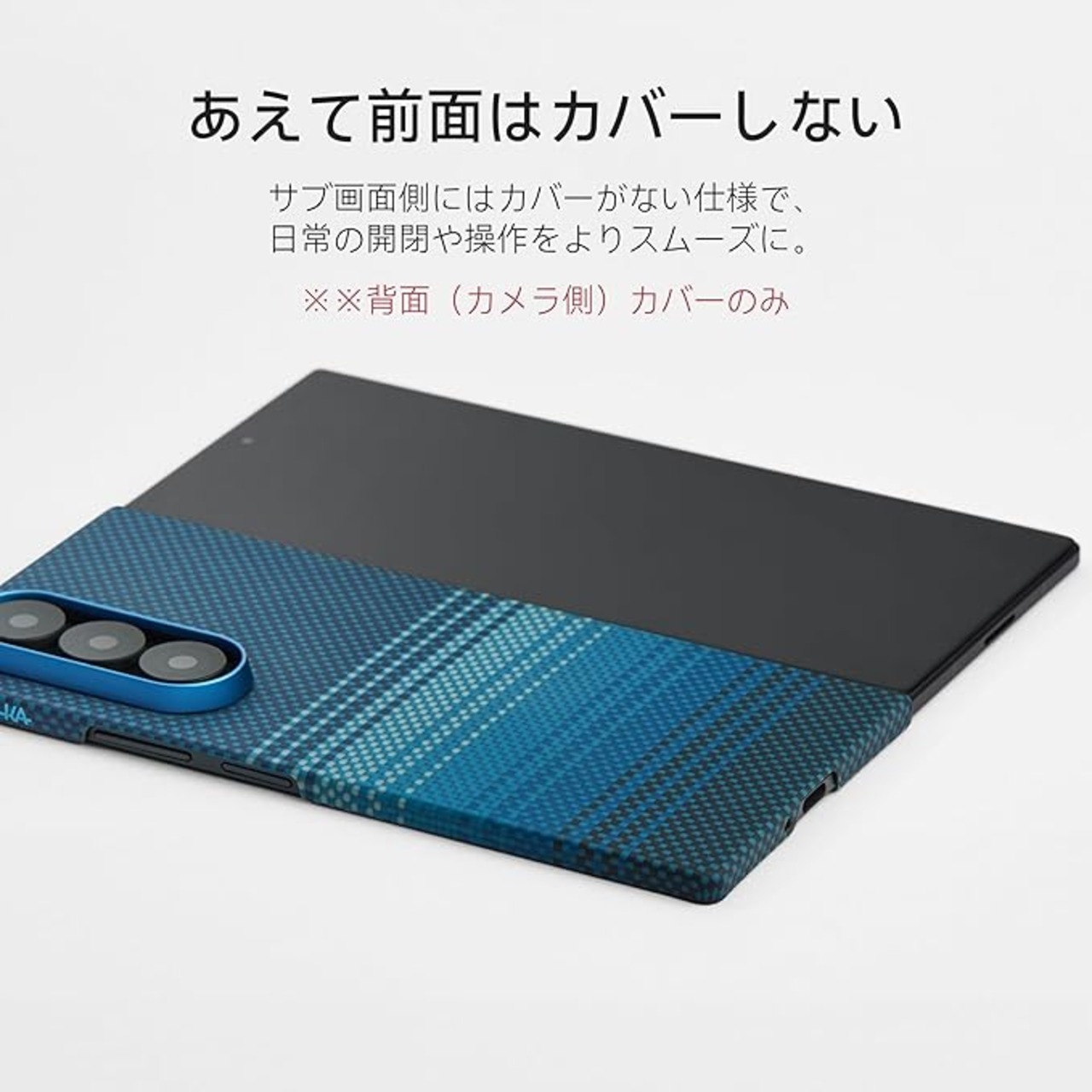 【保護性能を高める強靭素材】100%精選の600Dアラミド繊維から織られたアラミドクロスを真空成型して、スマホケースを成型させた後、コーティングやエッジの処理などをします。アラミド繊維でPITAKAスマホケースを仕上げるまでに、約40プロセスが必要となっています。航空宇宙グレードのアラミド繊維を使用しているため、優れた強靭性、耐久性、耐変色性を持ちます。 ※ご注意:Galaxy Z Fold7ケースは背面保護ケースのみで、前面カバーは付いておりません。