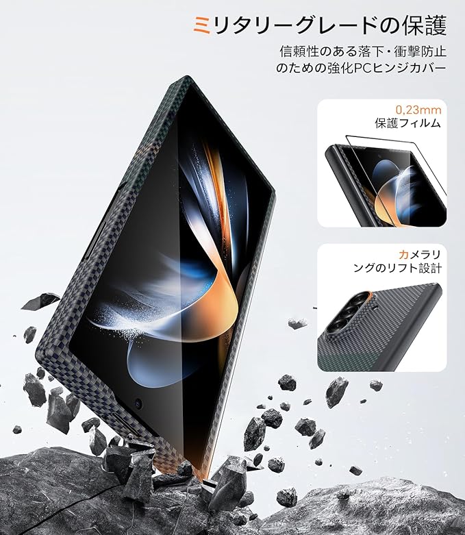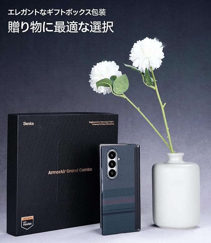 【360度全面保護 – グランドコンボ】:Samsung Galaxy Z Fold 7用にデザインされたBENKSの3-in-1グランドコンボは、ケブラー製バックケース、フロントフレーム、GlassWarrior HD保護フィルムを含み、ボリュームを増やすことなく全体的な保護を提供します。純正のデュポンケブラーを使用しており、軽量で耐傷性があり、エキシマUVコーティングで指紋防止効果があり、滑り止め加工が施されており、上質でプレミアムな手触りを実現しています。Galaxy Z Fold 7専用の全面保護ケースとして、見た目をきれいに保ちながら、柔らかい質感が快適なグリップを提供します。