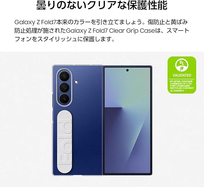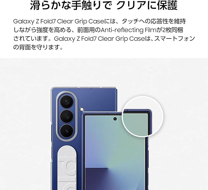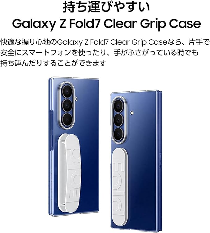 持ち運びやすいGalaxy Z Fold7 Clear Grip Case。快適な握り心地のGalaxy Z Fold7 Clear Grip Caseなら、片手で安全にスマートフォンを使ったり、手がふさがっている時でも持ち運んだりすることができます。 曇りのないクリアな保護性能。Galaxy Z Fold7本来のカラーを引き立てましょう。傷防止と黄ばみ防止処理が施されたGalaxy Z Fold7 Clear Grip Caseは、スマートフォンをスタイリッシュに保護します。