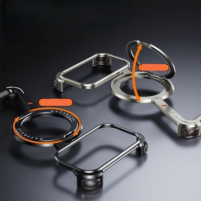 360 回転リングスタンド:ケース背面には、マグネット搭載・360 回転するリングがビルトインされています。スタンド機能が付いて、縦置き・横置き、どんな角度にもできます。