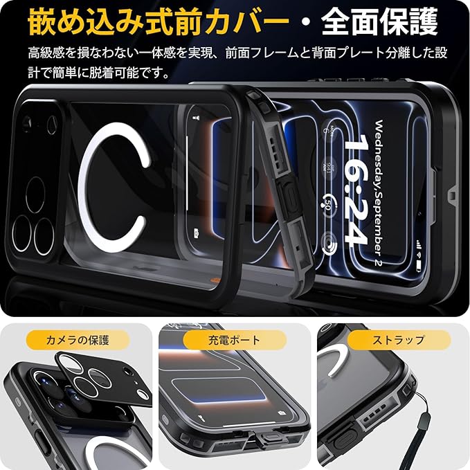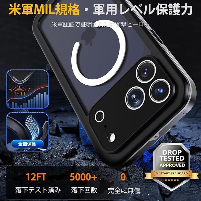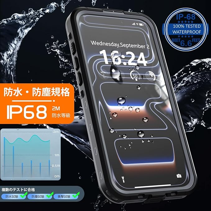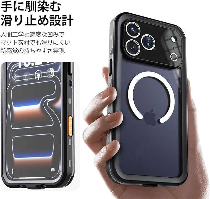 【IP68防水認証取得】iPhone 17 Pro Max 専用の完全防水防塵ケースです。最高防水レベルのIP68認証を取得し、水深さ2Mの水中に1時間まで水没でき、さらに水中撮影でも対応出来ます。防水機能だけでなく、砂・ホコリ・ゴミなどの侵入も防ぎますので、お風呂、水泳、釣り、温泉、登山、キャンプ、いつでもどこでもスマホをご安心してお使いいただけます。