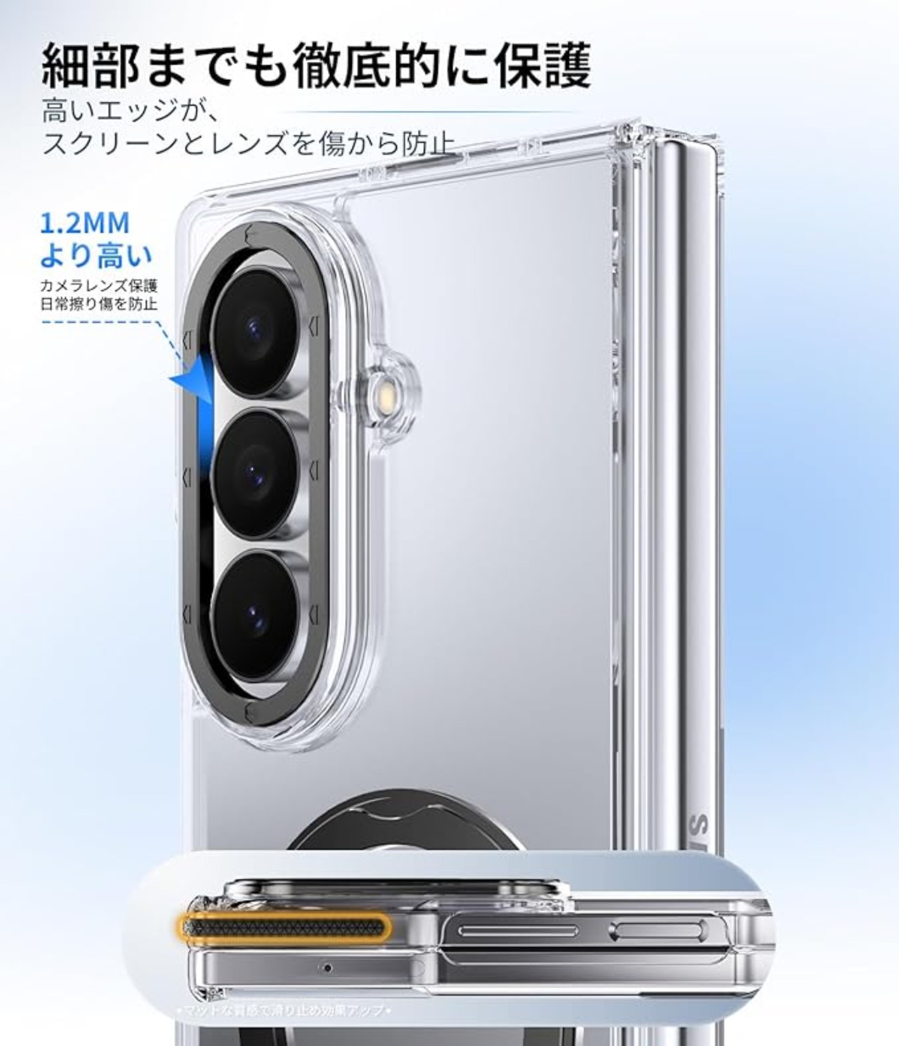 【側面滑り止】側面には滑り止めデザインを採用し、フレーム部分の繊細なテクスチャーが効果的に摩擦力を高めます。手滑りによるスマートフォンの落下を防ぐだけでなく、手に馴染むような握り心地を実現し、使用時の安全性を向上させています.