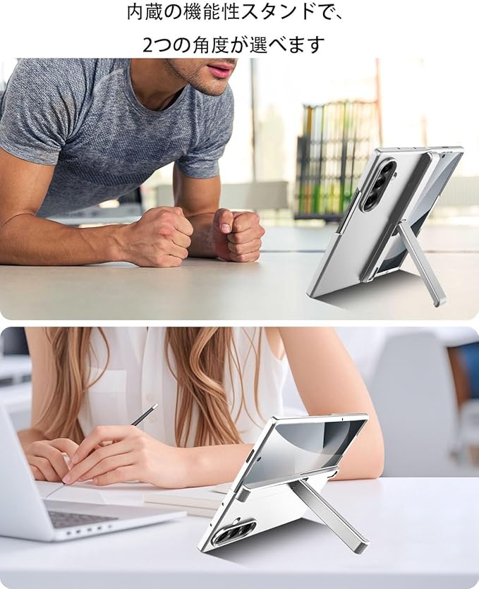 【キックスタンド|ヒンジ保護】折り畳み式ブラケットのデザイン。いつでもどこでも両手を解放して、大画面の楽しみを存分に味わうことができます。先進的な磁気ヒンジ保護技術搭載し、完璧に貼り合わせていながら、傷や落下から全方位で携帯電話を保護します。隆起した縁,背面のカメラの小さな穴を保護します,携帯電話の画面とカメラをより良く保護します。