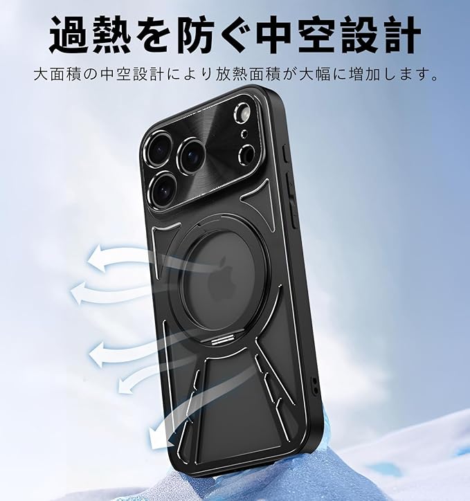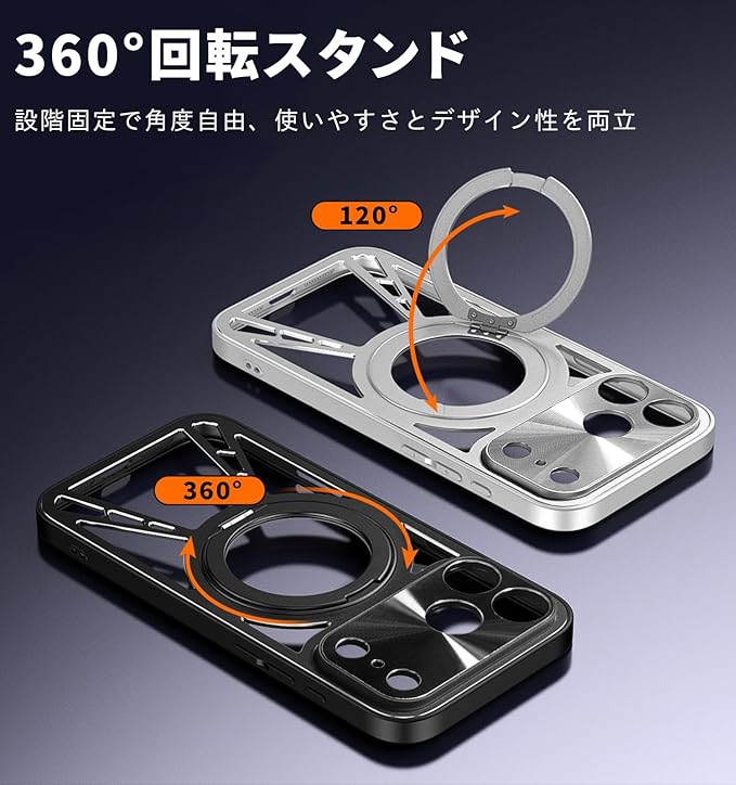 【360 回転スタンド】このiphone17Pro Max用ケースはアルミ合金リングと金属軸を採用で120 の開閉と360 回転が可能です。横起きあるいは縦起きはもちろん、絶妙なデザインで携帯を自由に多角度を調節でき、力よくスマホを支えて、映像や読書などに楽しめることができます。
