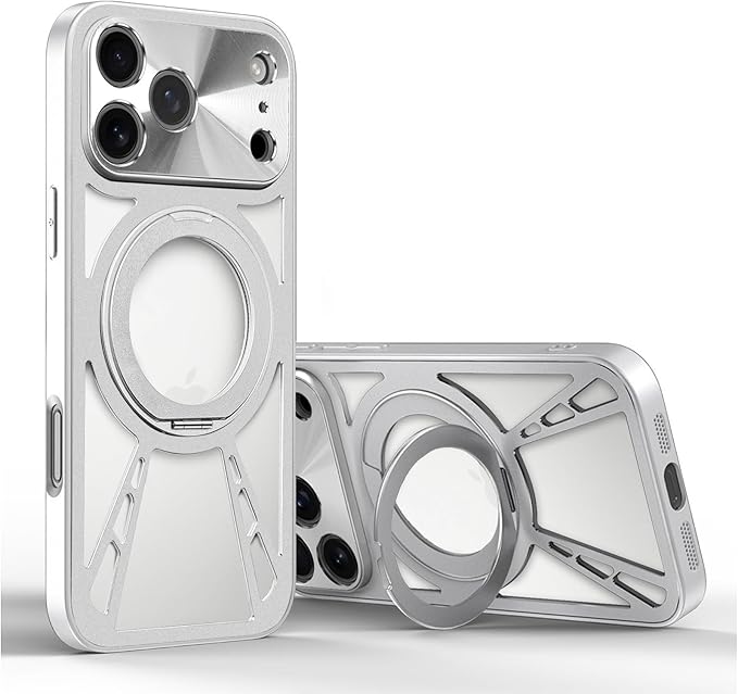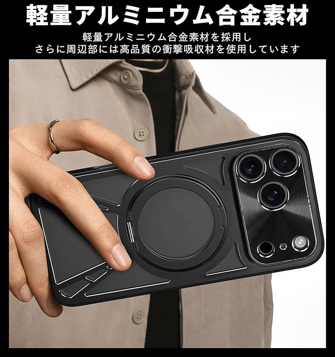 【対応機種】iPhone 17 Pro Max対応専用ケースです。誤差のない精密設計でボタンが押しやすいながら、デバイスにフィットします。対応機種を間違いないようにご購入お願い申し上げます。【360 回転スタンド】このiphone17Pro Max用ケースはアルミ合金リングと金属軸を採用で120 の開閉と360 回転が可能です。横起きあるいは縦起きはもちろん、絶妙なデザインで携帯を自由に多角度を調節でき、力よくスマホを支えて、映像や読書などに楽しめることができます。【航空用アルミニウム合金製ケ一ス】耐久性のある航空アルミニウム合金製で、一体型の保護ゴムパッドを備え、デバイスを損傷することなく強力な耐衝撃保護を提供します。薄型超軽量仕様ので、手に持っても重さを感じることが無い。ファッション性と実用性をを兼ね備えたデザインです。【Magsafe対応】マグネットが内蔵されている、MagSafe充電に対応しており、ケースを装着したままでもワイヤレス充電が可能。MagSafeアクセサリーともスムーズに連携でき、日常使いがさらに快適になります。【滑り防止・握り心地抜群】側面と内側は滑り止めPC素材で作られています。ベタつかず適度な柔らかさでクッション性があり、心地よく手にフィットして滑りにくいので落としてしまう心配が減ります。背面は通気口付きのアルミ合金製、耐久性や耐摩耗性に優れ、サラサラして触り心地もすごく良い質感です。