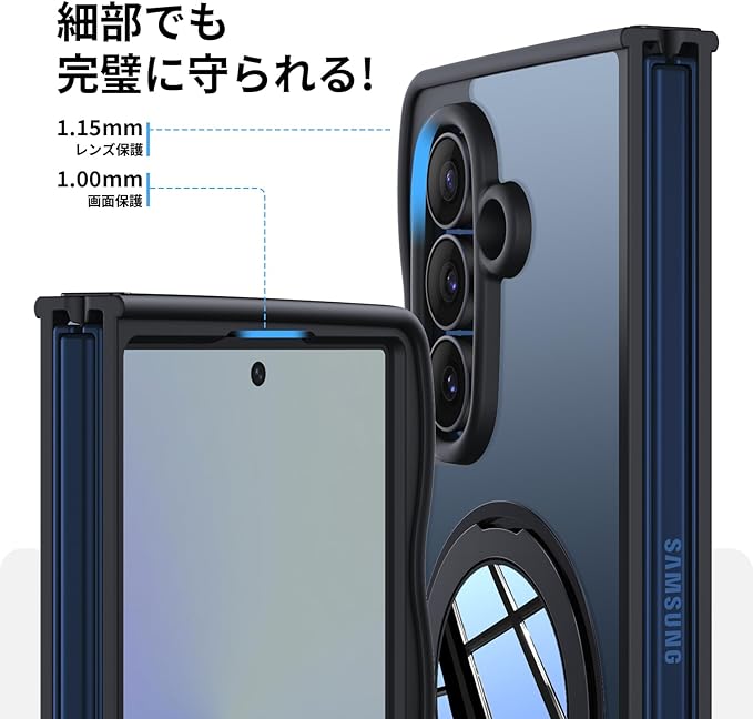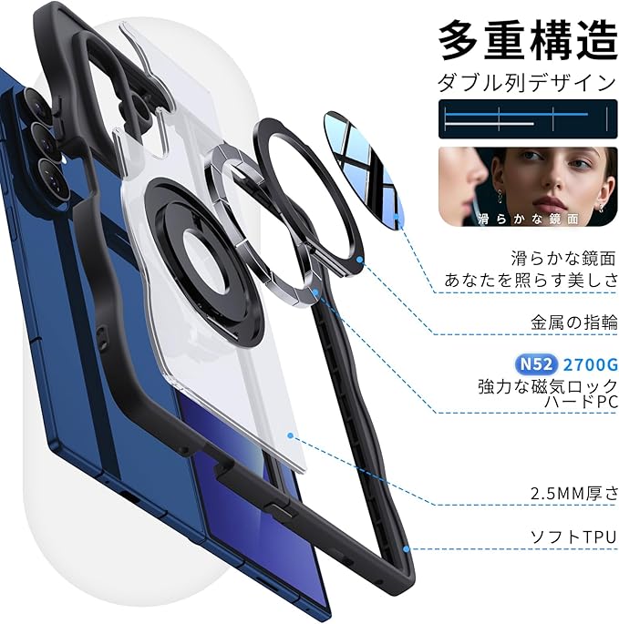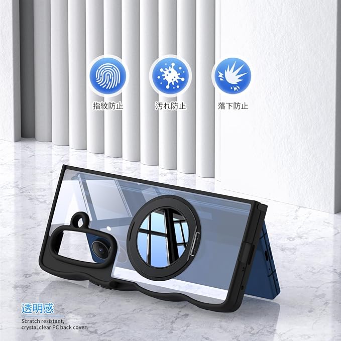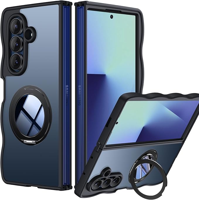 Galaxy Z Fold 7 用 ケース リング付き 360 回転スタンド 耐衝撃 米軍MIL規格 半透明 波形 ワイヤレス充電対応 指紋防止 黄ばみ防止 滑り止め ギャラクシー Z fold7/SC-56F/SCG34 カバー (ブラック)N522-zfold7-01 | KAZESHOP
