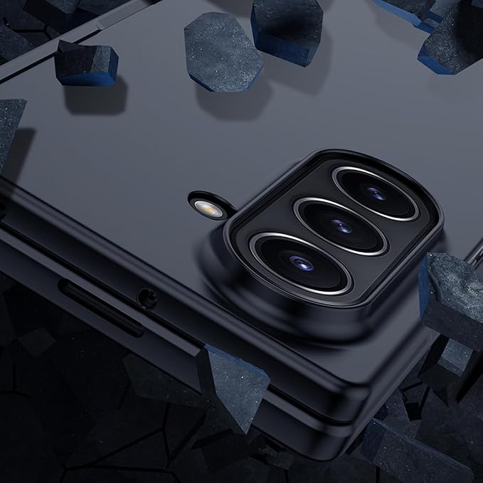 -【完全装甲構造】【折り畳み最適化】高密度PC素材が端末全体をシームレスに包囲。ヒンジ部分に可動式プロテクションカバーを内蔵し、繰り返し開閉動作時の衝撃を分散吸収。カメラ周囲に立体リップ構造を配置し、精密部品を多方向から保護。
