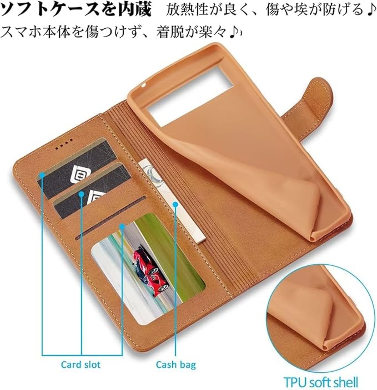 【耐衝撃性】耐熱性と柔軟性を誇る上質なPUレザーで作られ、手触り良い、落下時の衝撃を効率的よく吸収できるようにケースの各コナーの裏側が設計されています。丈夫でほど良い厚みで、落としてもスマホをきちんとお守れます。