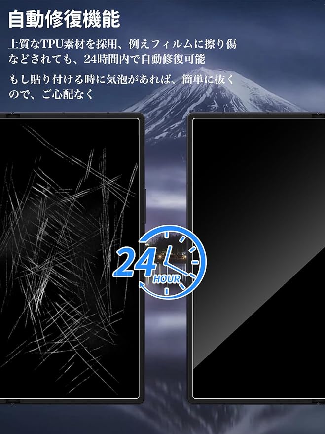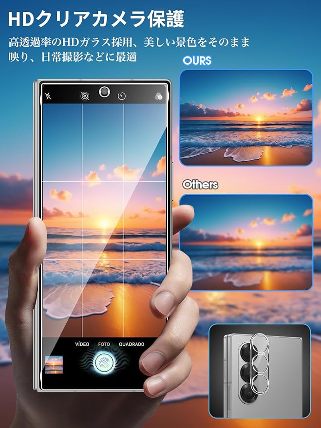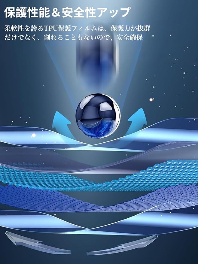 【上質素材保護フィルム】一番の保護性能を提供するために、このスマホ保護フィルムは業界一番の9H硬度の旭硝子素材を採用しております。日常利用中で万が一スマホ落下するなどになってしまえば、保護フィルム貼り付けられては最大限にカメラレンズを保護できます。フィルムが割れてもガラス破片が飛散することを防げます。(ご注意:前スクリーン用の保護フィルムはTPU製で、ご了承ください。)