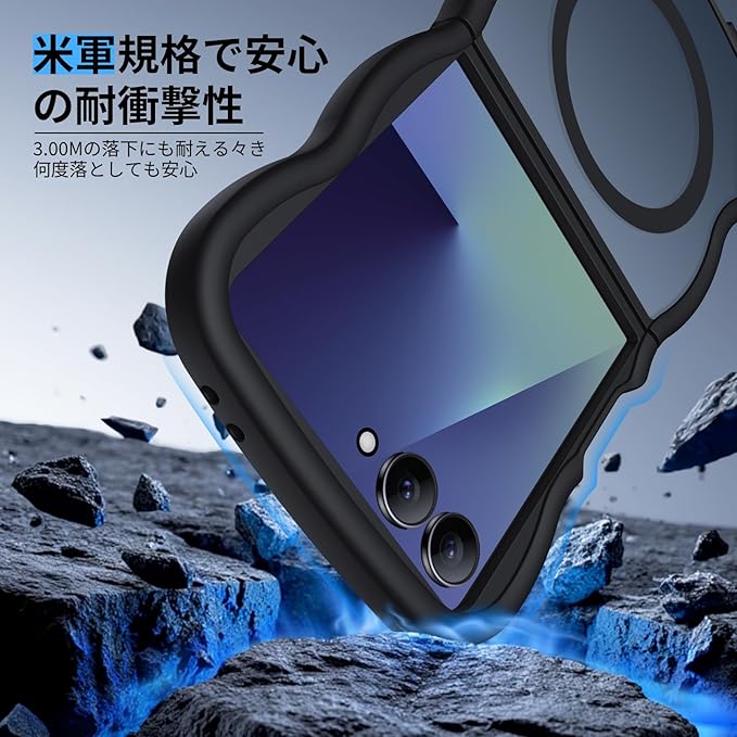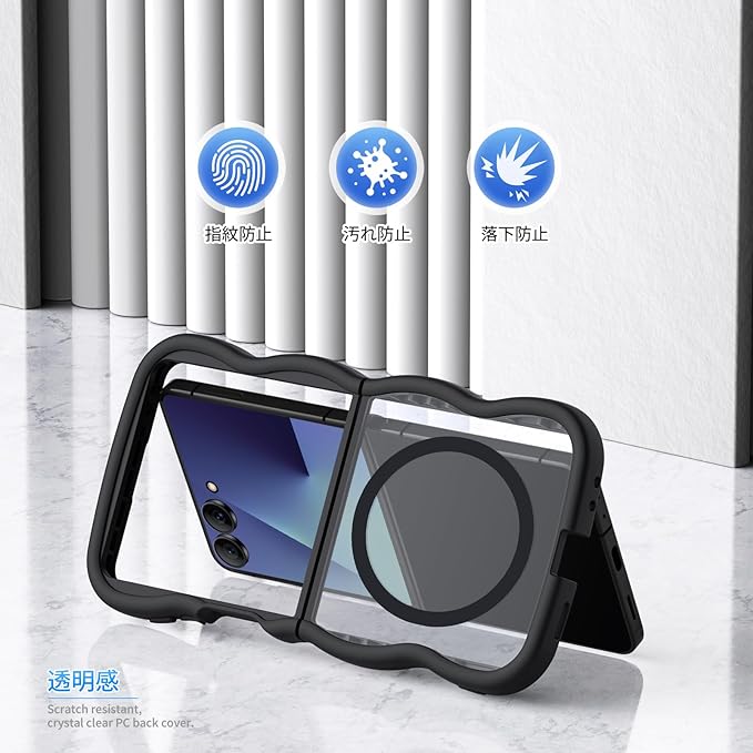Galaxy Z Flip7 用 ケース 耐衝撃 米軍MIL規格 半透明 波形 ワイヤレス充電対応 指紋防止 黄ばみ防止 滑り止め ギャラクシー Galaxy Z Flip7 用 カバー (ブラック)N523-zflip7-01 | KAZESHOP